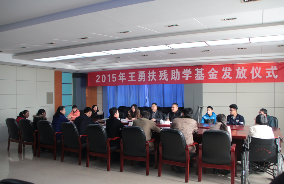 第24个国际残疾日到来之际,12月2日下午,2015年王勇扶残助学基金发放仪式暨受助学生座谈会在山东中医药大学行政楼424会议室举行。山东省残疾人福利基金会秘书长董景法,扶残助学基金出资者、山东中医药大学校友、公司董事长王勇,副校长田立新出席仪式,学生工作处相关人员、相关学院分管书记及全体受助学生参加活动。