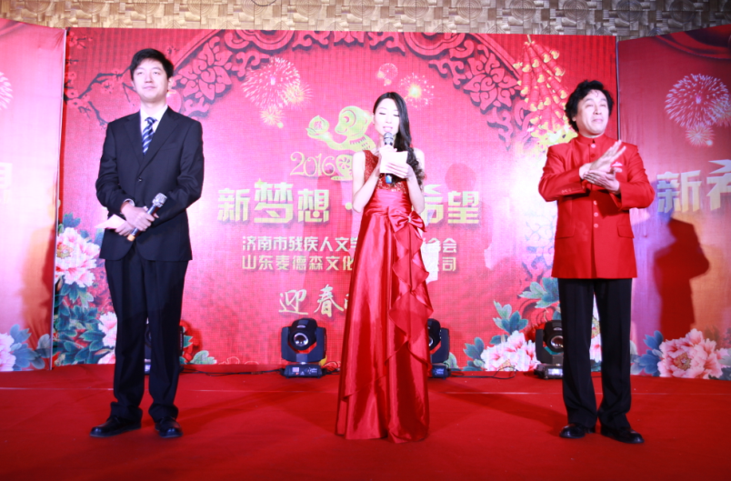2016年1月24日,济南市残疾人文学艺术界联合会(以下简称市残疾人文联)、山东麦德森文化传媒有限公司主办的“新梦想·新希望”迎春晚会在鱼翅皇宫大酒店圆满落下帷幕。出席本次晚会的有山东省新闻出版广电局、山东广播电视台、山东省残联、山东省残疾人福利基金会、济南市残联、济南市历下区残联、山东中医药大学等单位的领导和老师,以及山东麦德森文化传媒有限公司请到的来自全国各地的合作伙伴,与会人员350余人。晚会残健交融,欢声笑语,共同度过了一个难忘而欢乐的夜晚。
