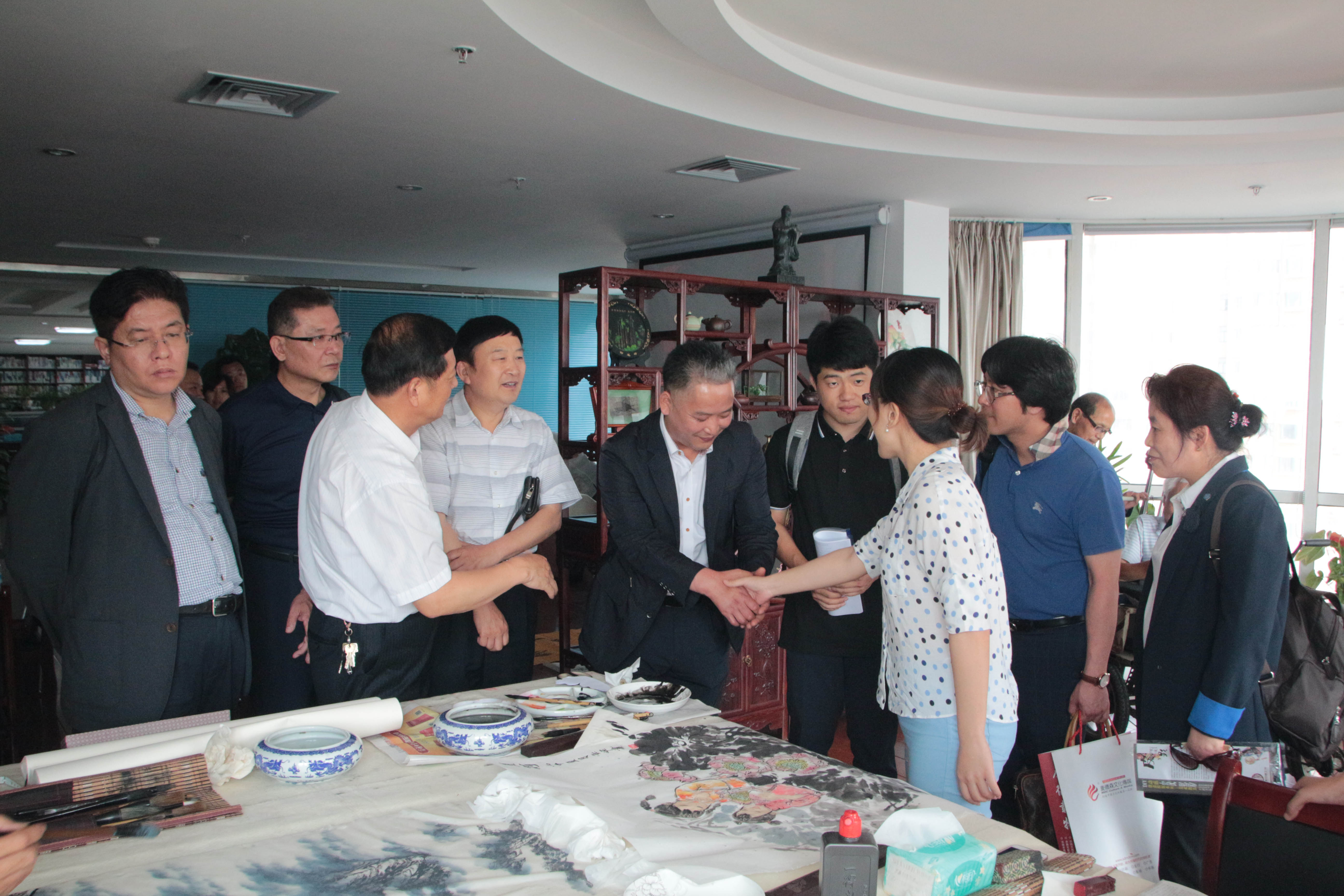 为欢迎金名柱会长一行人的到来,济南市残文联书法家协会、美术家协会和民间艺术协会的艺术家们在我集团书画交流中心挥毫泼墨。金会长一行人纷纷表示他们对此深受感动,不但是被中国朋友的热情好客所感动,更是被中华文化之美所感动。残疾人艺术家们与异国的障碍经纪人协会跨越了语言的障碍,以艺术会友,进行融洽而和谐的文化交流。交流结束后,艺术家们纷纷向异国友人赠送了自己的墨宝与剪纸,以此表示对他们的热烈欢迎以及对两国文化不断交流的热切期许。