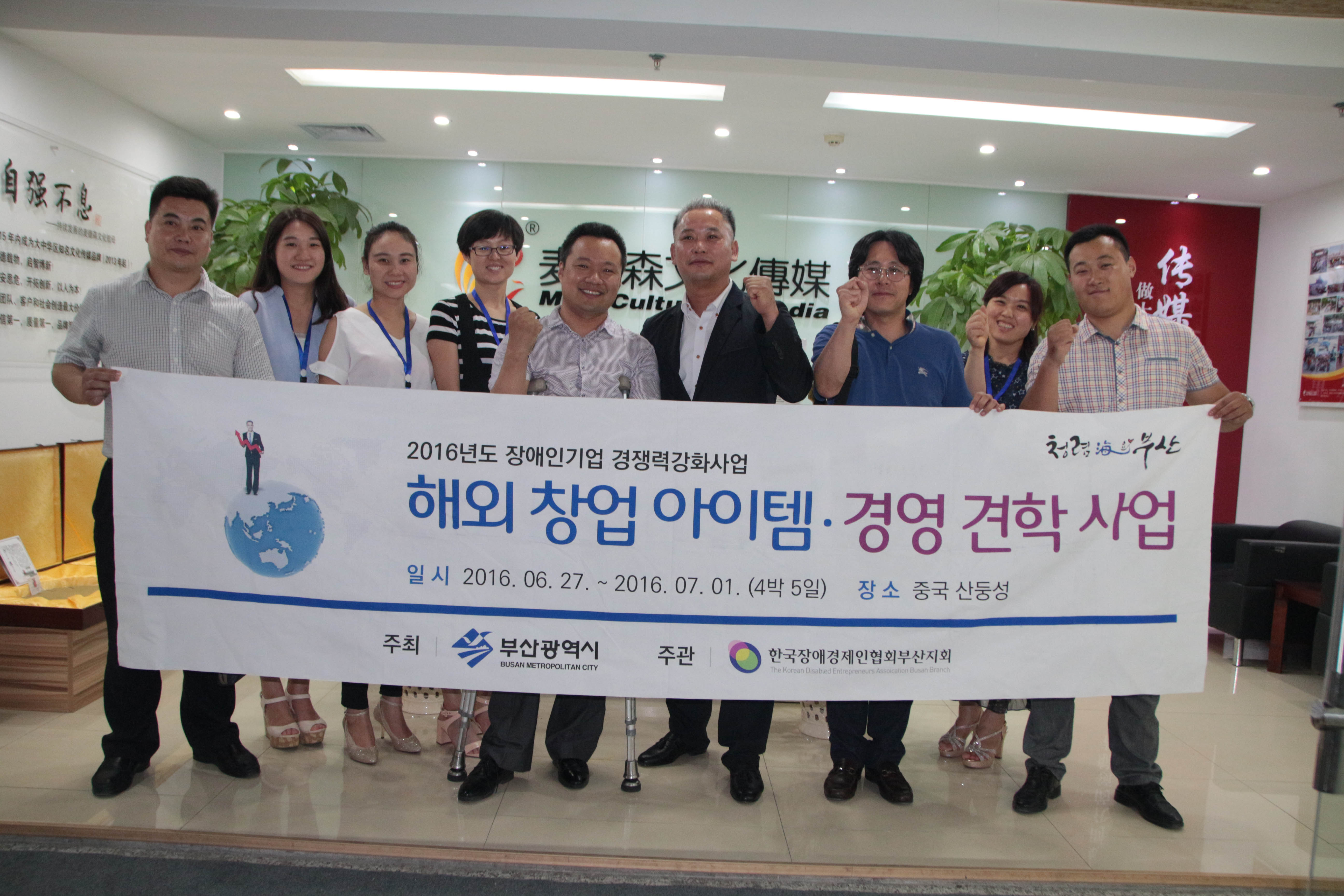 2016年6月28日,在山东省残疾人福利基金会负责人杨忠民、山东省残疾人福利基金会办公室主任付存举、济南市残疾人联合会副理事长张恒臣等领导的陪同下,韩国障碍经纪人协会釜山支会会长金名柱、韩国障碍经纪人协会釜山支会团长崔株镐、韩国障碍经纪人协会釜山支会顾问安成民等组成的韩国文化访问使团莅临我集团公司考察指导工作。