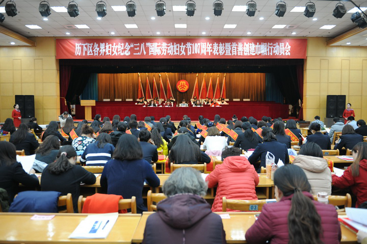 会上,与会同志集体观看了历下区妇女儿童工作“十二五”规划工作纪实片;隆重表彰了历下区三八红旗手、三八红旗集体、巾帼建功标兵、巾帼文明岗、示范妇女之家、维护妇女儿童权益先进个人和维护妇女儿童权益先进个人,下发了区妇联《关于在全区开展“凝聚力量促发展,首善创建巾帼行”主题活动的实施方案》并向全区广大妇女发出活动倡议。