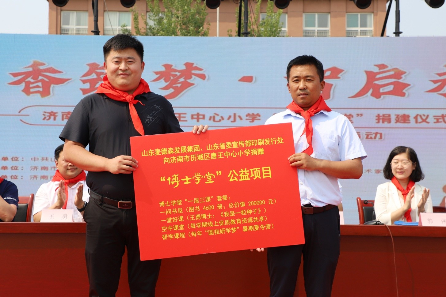 活动中,山东麦德森发展集团捐建的第24座“博士学堂”落地历城区唐王中心小学;山东麦德森发展集团党委书记、董事长王勇出席,并以《我是一粒种子》为题做励志宣讲。
