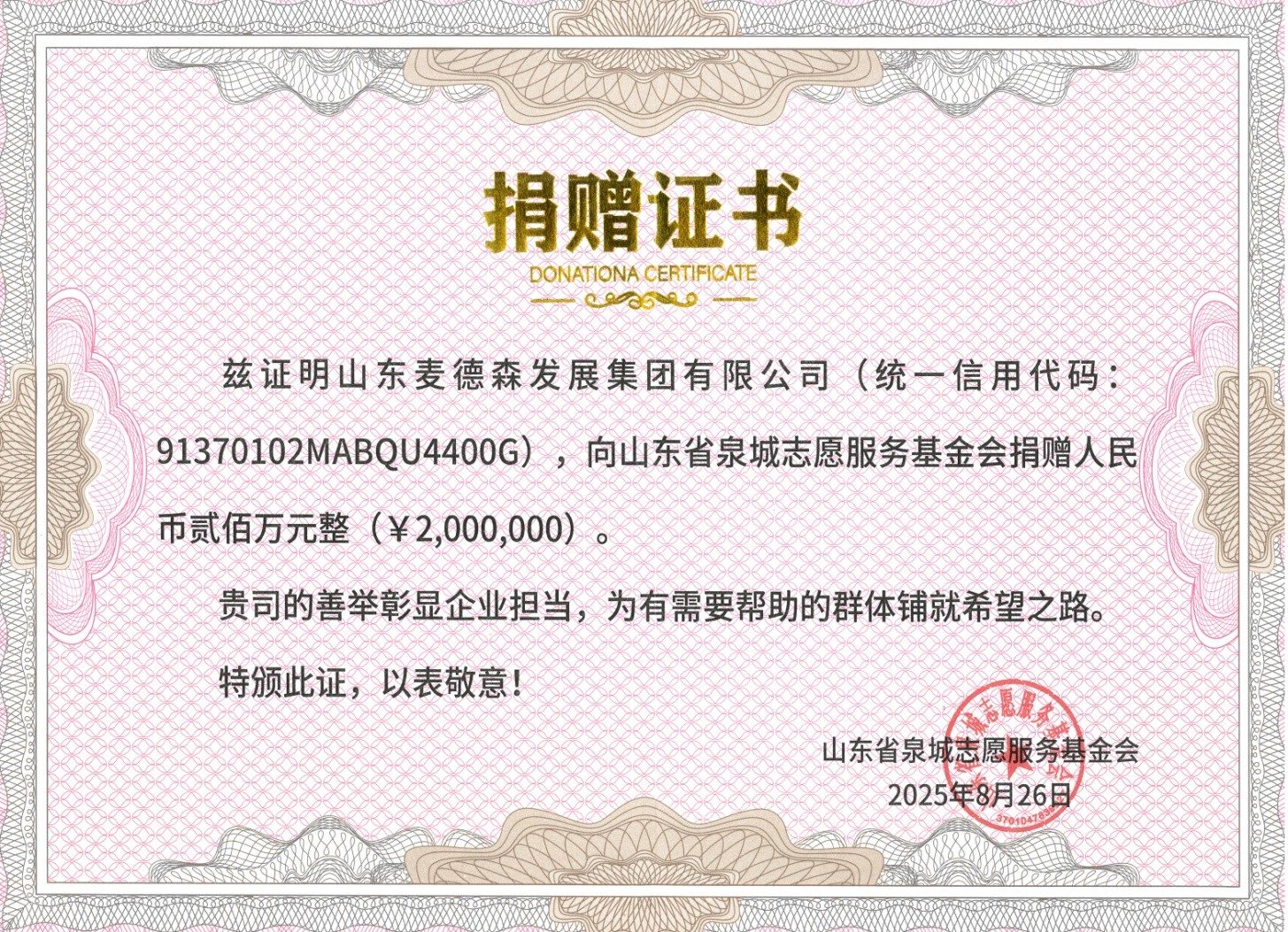 山东麦德森发展集团始终秉承“扛着党旗创业,戴着党徽奉献”的政治信念,探索总结“长鼓型”党建工作式,实现企业发展与党建工作“共商共建共享”。多年来,企业持续秉承“内求利他、济世立功”的价值观,在扶残、助学、脱贫攻坚、乡村振兴等领域勇担社会责任,累计捐款捐物4000余万元。在承担社会公益逐步走向制度化、规范化的同时,努力探索独具特色的麦德森公益之路。
