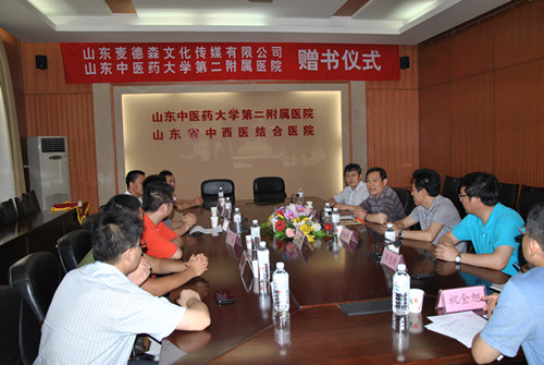 会议还举行了捐赠仪式:由王勇董事长代表麦德森文化传媒有限公司向山东中医药大学第二附属医院捐赠图书。郭恩浦院长代表二附院向王勇董事长赠送“真情系母校 捐书献爱心”锦旗和“荣誉职工”证书。