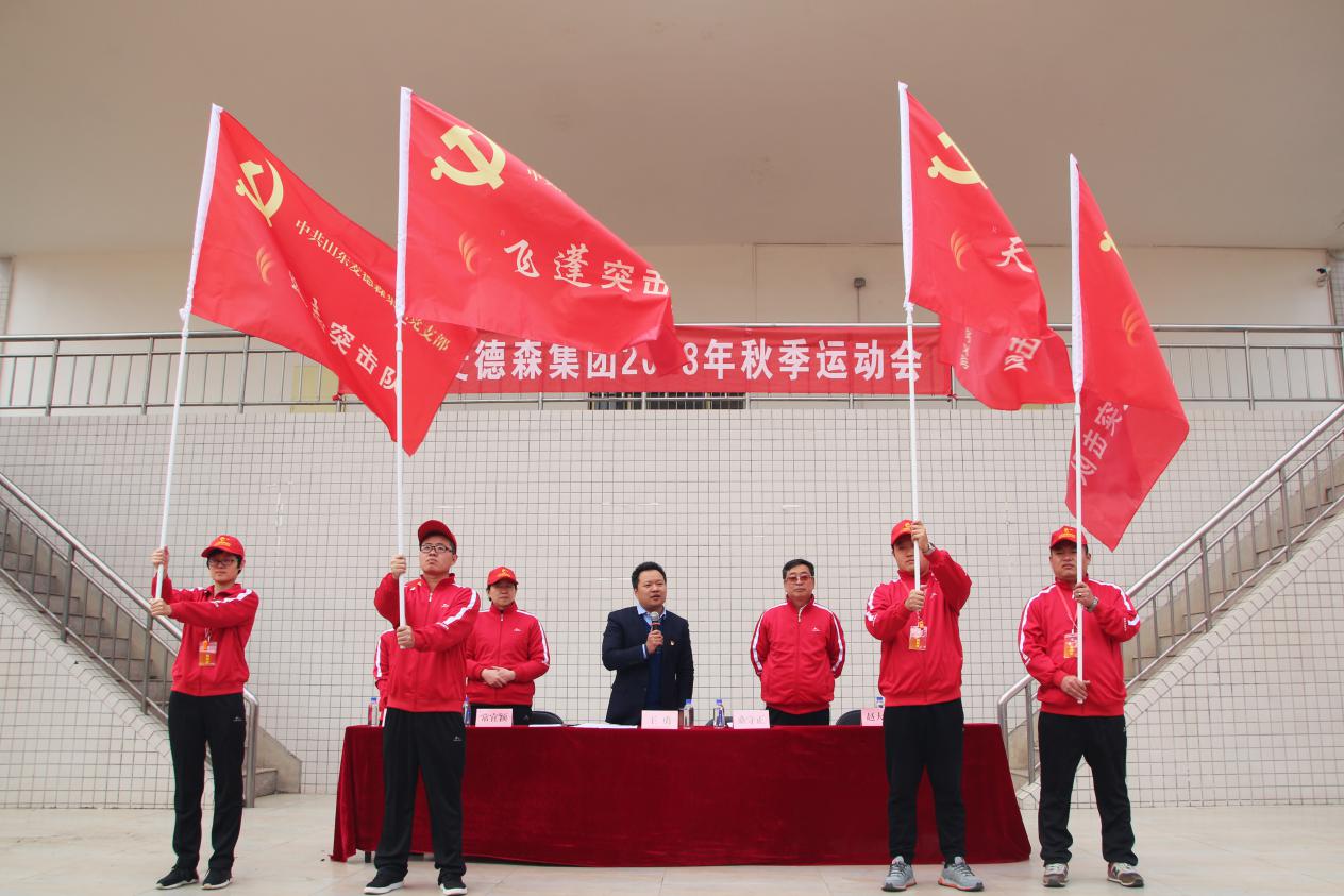 同时,在运动会开幕式上,宣布了组建的江南在线注册公司党支部党员突击队成员名单,并由王勇董事长为各队队长授旗。