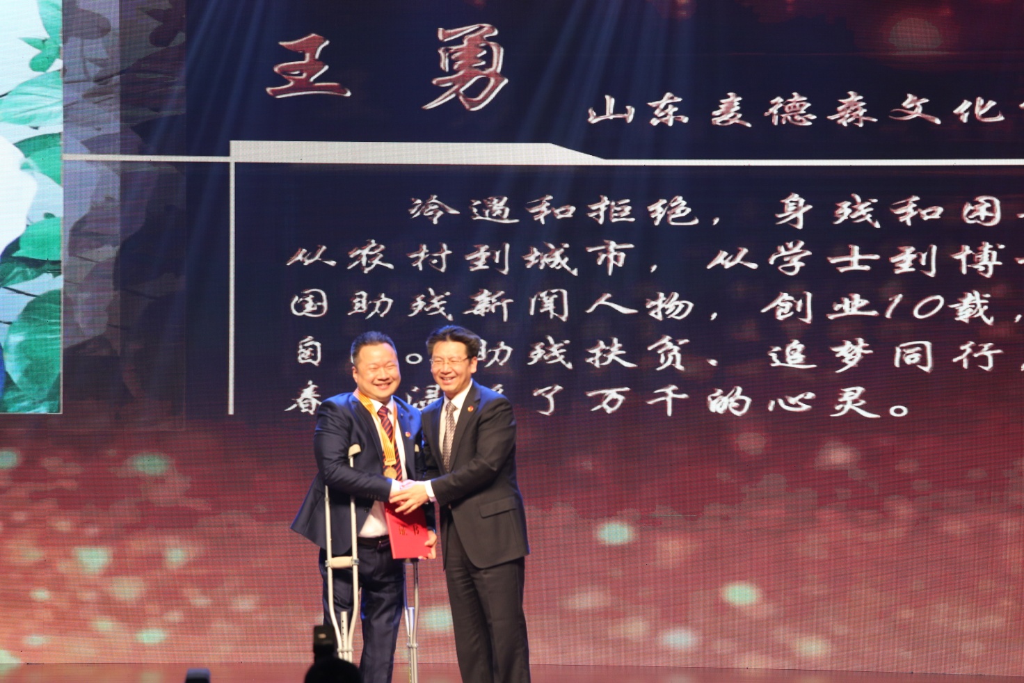 “冷遇和拒绝,身残和困苦都不曾将他击垮,从农村到城市,从学士到博士,从残疾青年到全国助残新闻人物,创业十载,他用自强不息证明自己,助残扶贫,追梦同行,他燃烧自己的青春,温暖千万心灵。”