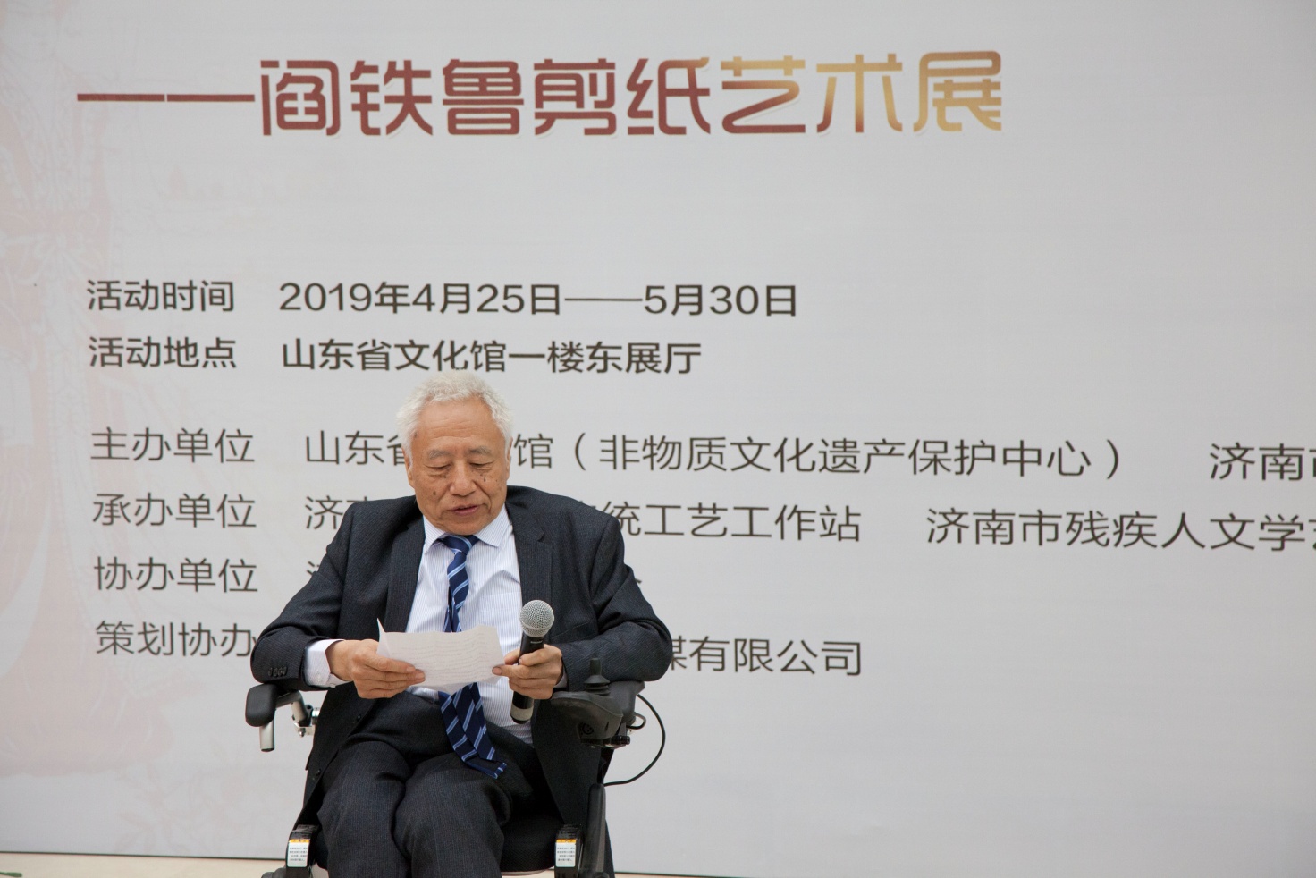 为向“建国七十周年”献礼,喜迎第二十九个“全国助残日”,由山东省文化馆、山东省非物质文化遗产保护中心、济南市残疾人联合会联合主办,济南市百花洲传统工艺工作站、济南市残疾人文学艺术界联合会、济南工艺美术学会协办,我集团负责策划的《献礼“建国七十周年” 喜迎“全国助残日” 优秀残疾人阎铁鲁艺术剪纸展》,于2019年4月25日在山东文化馆开幕,开幕式由济南市残疾人联合会康复中心主任吴哲主持。受集团党支部书记王勇博士委托,集团党支部副书记桑守正同志出席此次活动。