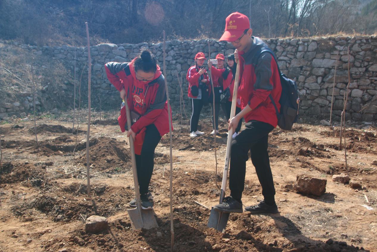 植树现场,大家热情高涨,干劲十足,到处都是热火朝天的景象。在林场工作人员的指导下,大家脱去外衣,挥动镐头和铁锨,挖坑栽苗,培土浇水,认真仔细的完成每一道工序,经过近一个小时的紧张劳动,所有树苗全部栽植到位,看着一株株迎风挺立的树苗,每个人脸上都洋溢着幸福的笑容。