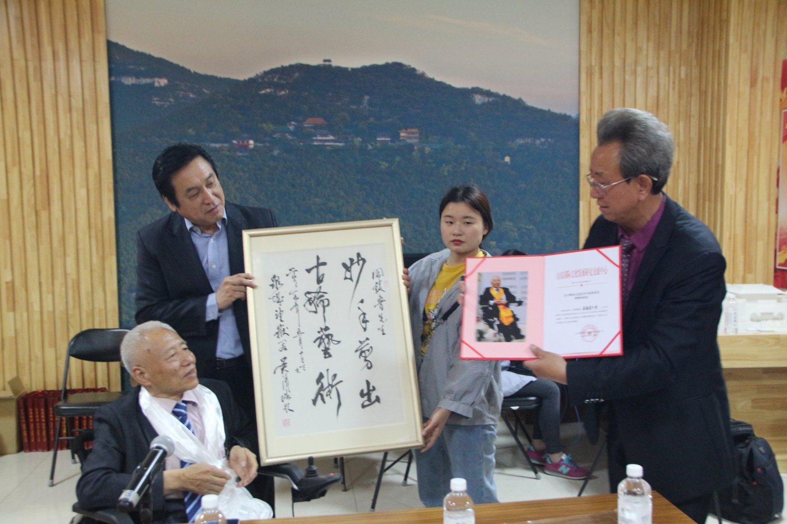著名学者型社会活动家、北京大学齐鲁发展研究会名誉会长、齐鲁文化艺术名家讲坛组委会艺术总监吕季明院长为阎铁鲁先生颁发山东省对外文化交流研究发展中心理事证书并献哈达;百花洲传统工艺工作站代表张冰向阎铁鲁先生颁发证书。