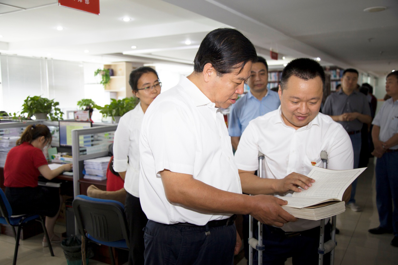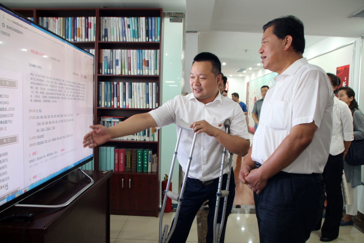 在王勇博士的陪同下,山东省委政法委办公室党支部全体党员对集团整体业务发展、集团党建工作、医学知识信息服务平台——“博览医书”项目以及残疾人事业发展等内容进行了深入了解。王勇博士对医学知识信息服务平台——“博览医书”项目亲自进行演示和讲解,汇报了自己开发“博览医书”项目的初衷,以及对于中医药事业发展的远大目标理想,得到了林峰海书记的高度认可和赞赏。