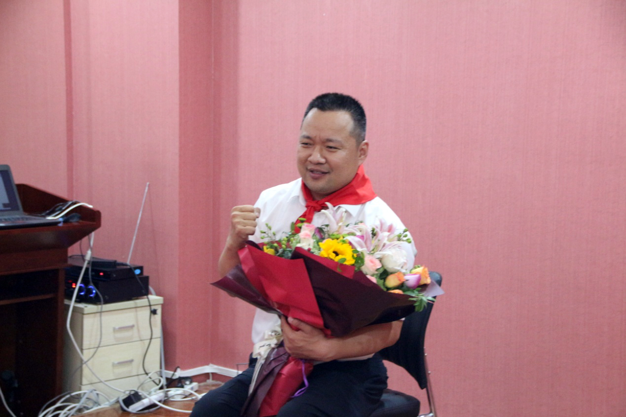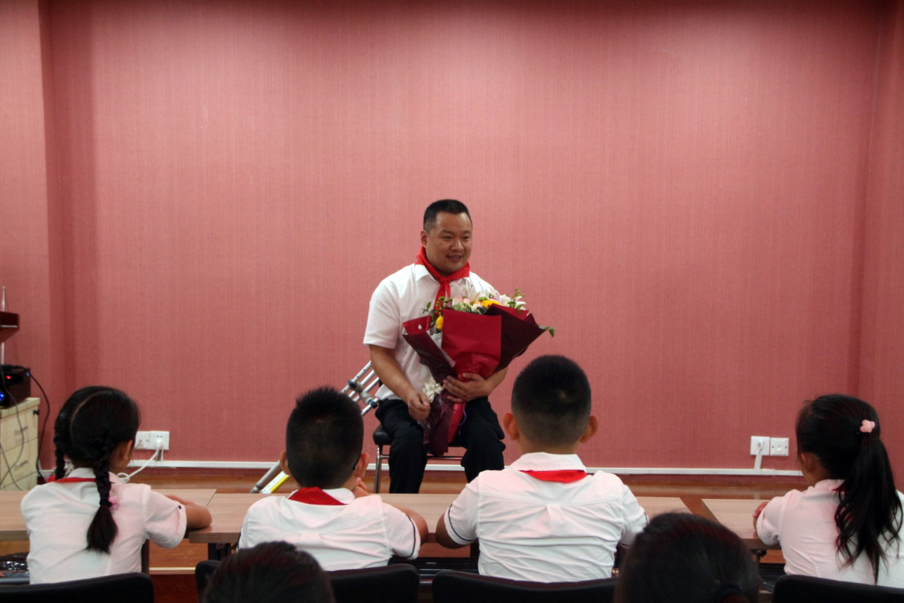活动伊始,少先队员们观看了王勇博士的专题纪录片《拄着双拐一路奔跑》,大家被纪录片中王勇叔叔求学创业、助残扶残的画面深深感动。随后,少先队员代表向王勇叔叔敬献鲜花,并亲手为王勇叔叔佩戴红领巾。