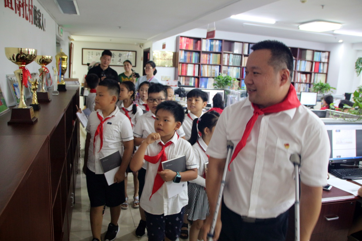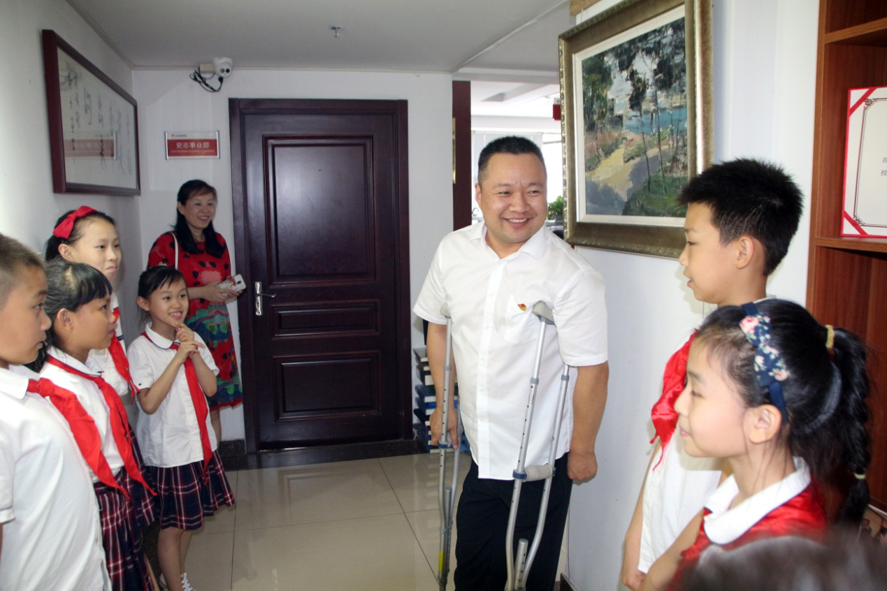 在王勇博士的带领下,少先队员们对我集团包括企业文化墙、残疾人文化长廊、企业荣誉展架以及党建活动室等场所进行了实地参观。