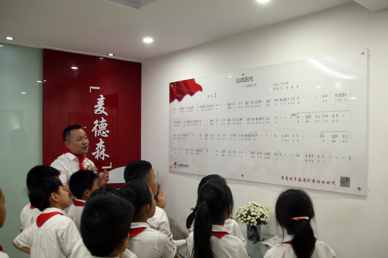 座谈结束后,王勇博士带领少先队员们参观了麦德森总部。参观过程中,少先队员们被济南麦德森荣耀80足球俱乐部奖杯深深吸引,王勇博士鼓励大家暑假期间走出家门,踏上绿茵场,去体验足球带给大家的快乐;在集团歌曲乐谱前,少先队员们跟随王勇叔叔视唱麦德森主题曲《心向阳光》。