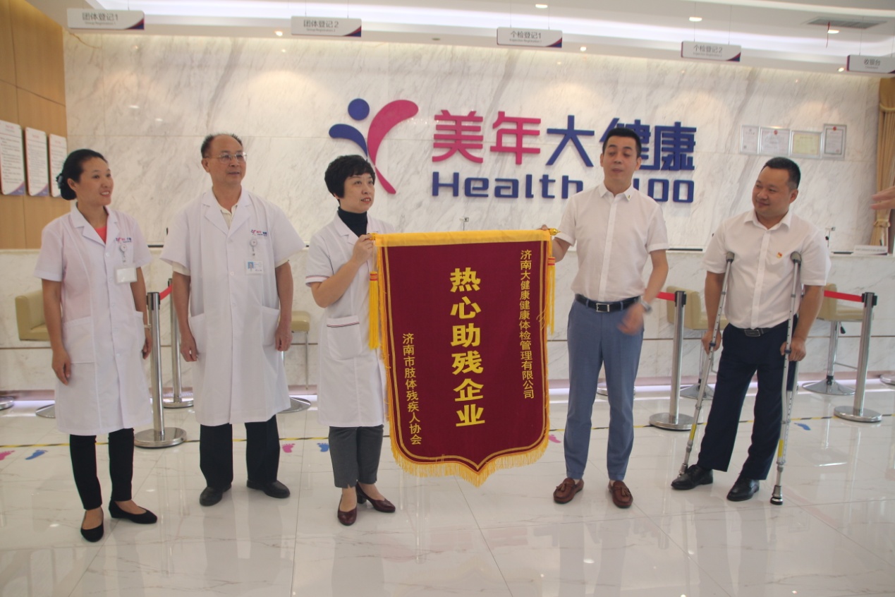 体检现场,济南市肢残协会主席、我集团党支部书记王勇博士在美年大健康济南公司总经理冯磊的陪同下,对体检中心进行了参观,并代表济南市肢体残疾人协会向济南大健康健康体检管理有限公司赠送“热心助残企业”锦旗。