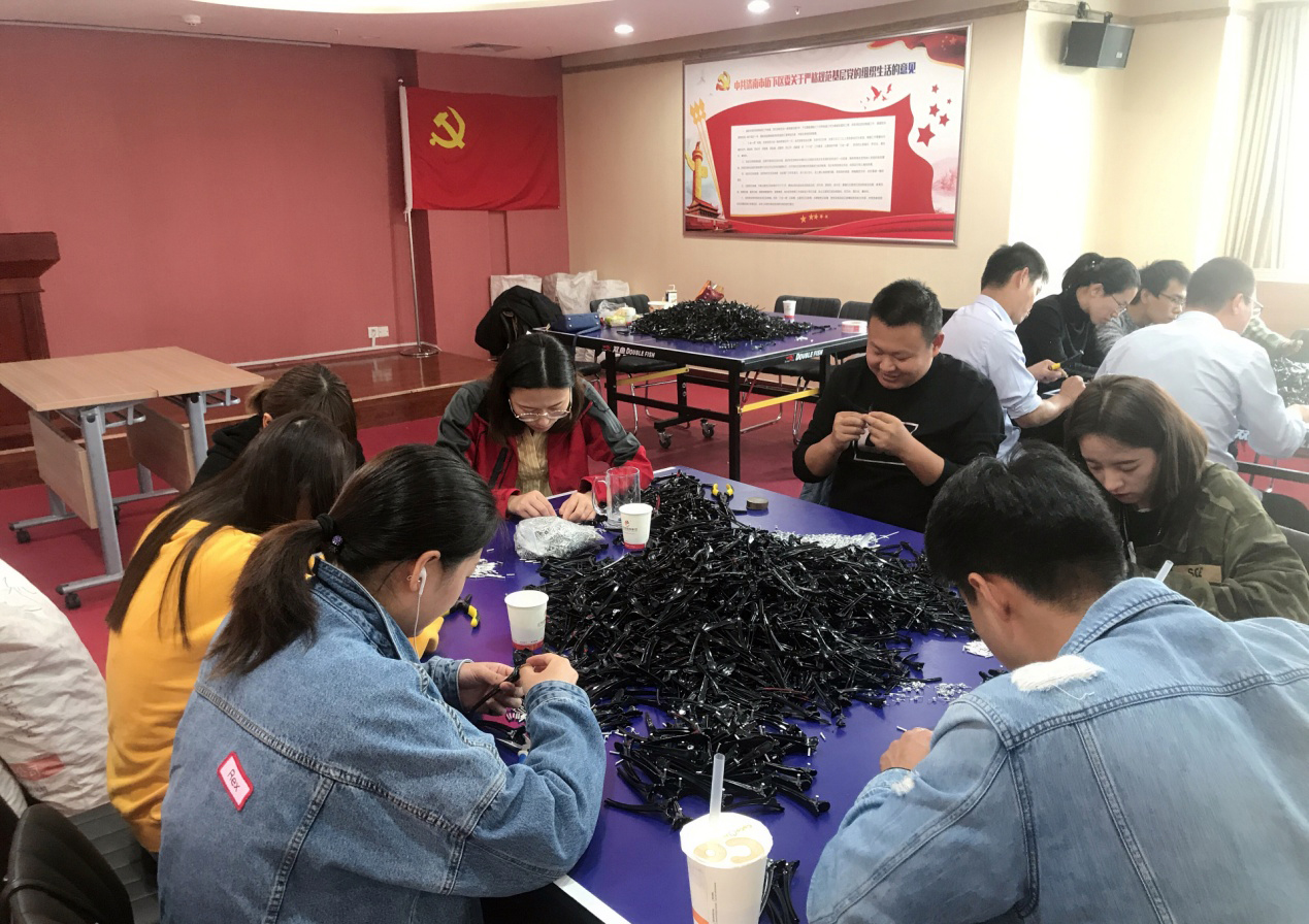 得知此事后,集团党支部五支党员突击队全体队员在不耽误自己本职工作的前提下,纷纷主动出击,承接突击任务,协助刘七沟村残疾人就业基地完成订单。10月19日-20日,在集团党支部书记王勇博士的带领下,五支党员突击队全体队员自愿放弃宝贵的周末假期,全员来到突击任务一线,投入到紧张而有序的突击工作中。