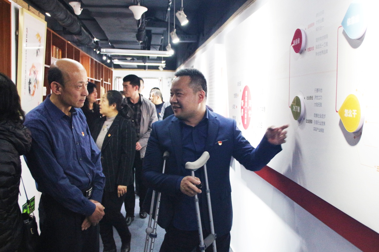 在党建活动室,王勇博士结合企业党建材料就现阶段集团支部建设工作向刘主任等领导作出详细汇报。汇报中,王勇博士向领导们介绍了以集团党员为核心的党员突击队和以党支部为堡垒、党员为先锋、突击队为支撑的“长鼓型”党建工作模式,得到了刘主任等领导们的高度认可。