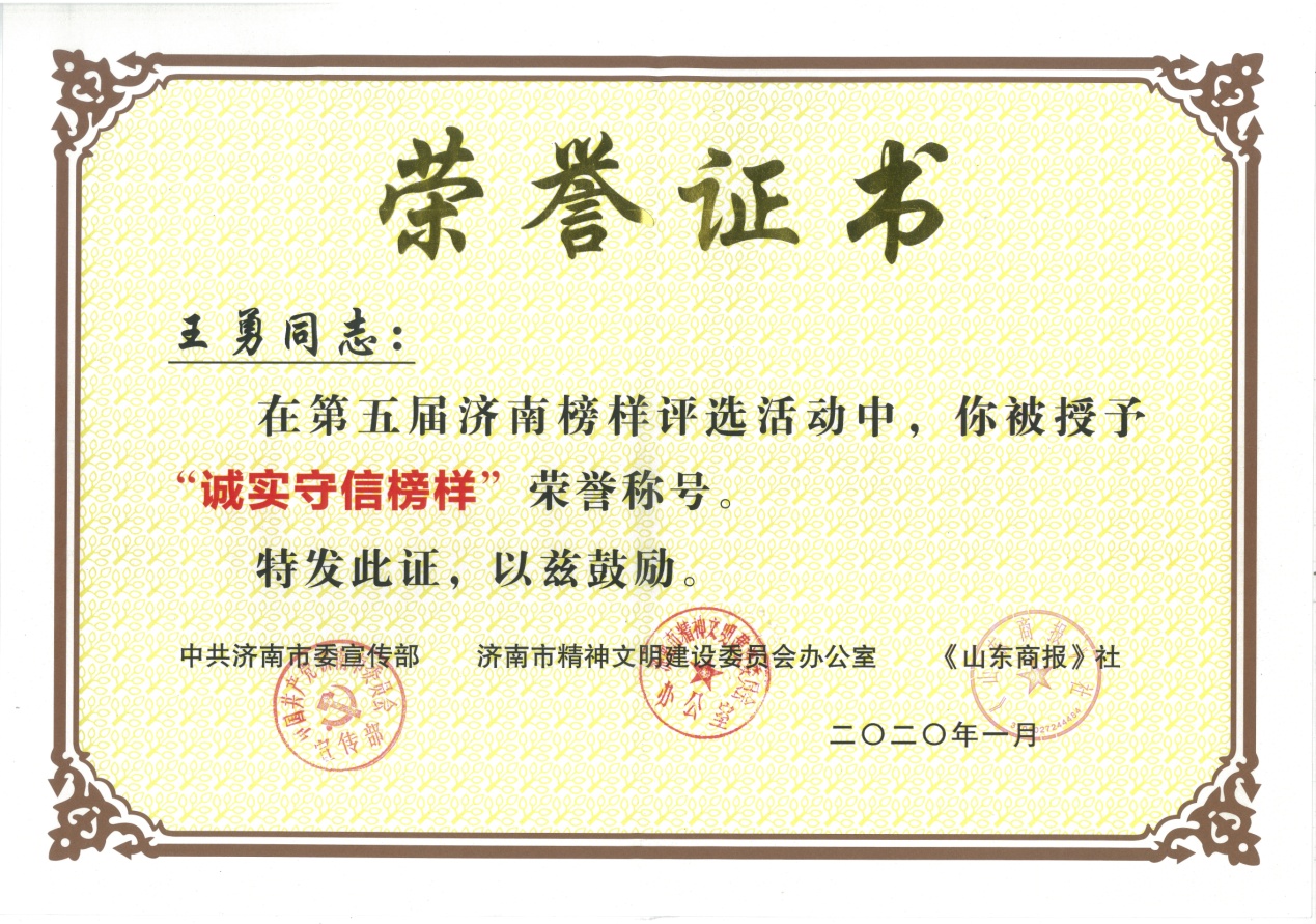济南市人大常委会副主任许强,济南市副市长王桂英,中共济南市委宣传部副部长伊沛扬,山东省文化旅游发展集团副总经理兼鲁商传媒集团党委书记、董事长孙超,鲁商传媒集团总经理、总编辑庞道锋等领导和嘉宾出席典礼。我集团党支部书记王勇博士出席典礼,并现场领取第五届“济南榜样——诚实守信榜样”荣誉证书。