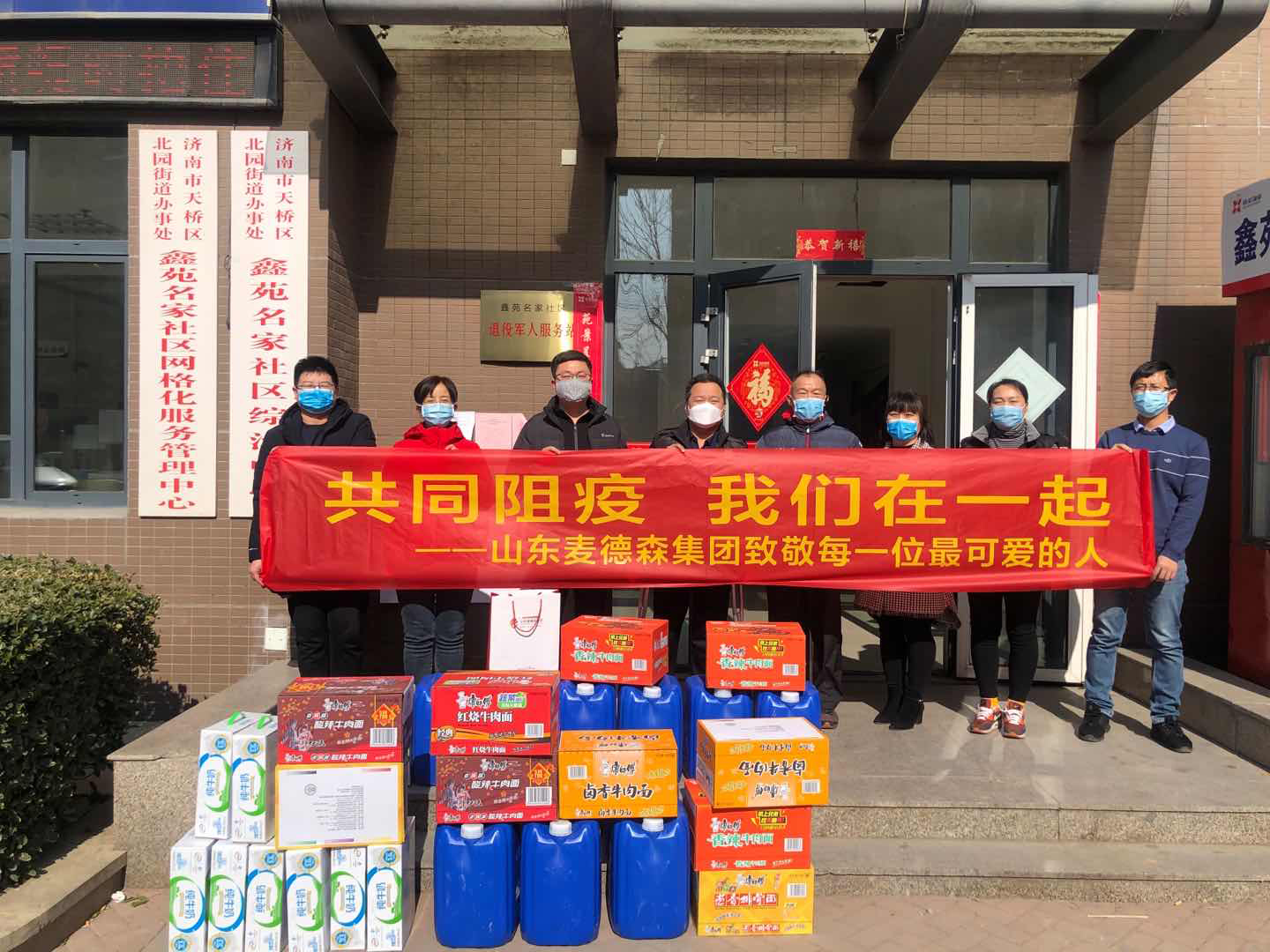 2月10日上午,我集团党支部书记王勇博士带领企业员工来到天桥区北园办事处鑫苑名家社区,向社区捐赠消毒液等总金额1万余元的抗疫物品,助力疫情防控。