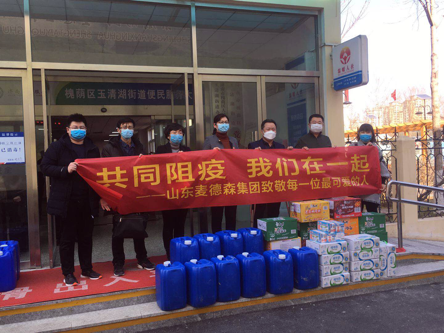 在北园办事处鑫苑名家社区稍作停留后,我集团党支部书记王勇博士又带领企业员工来到济南市槐荫区玉清湖街道办事处,向街道捐赠口罩等总价值1万多元的抗疫物资,助力疫情防控。王勇博士表示,共同阻疫,我们在一起!希望就在前方,加油!