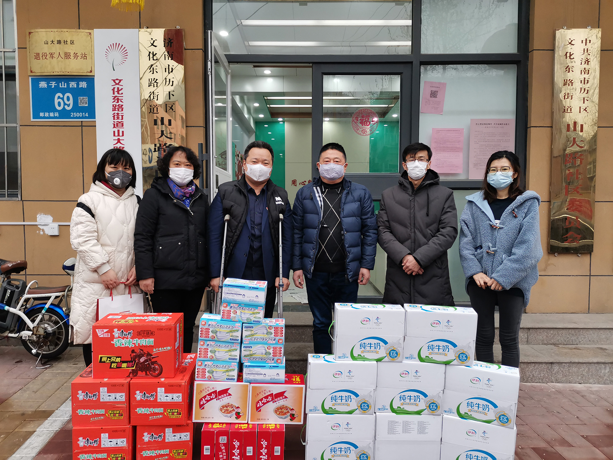 在燕山街道短暂停留后,我集团党支部书记王勇博士又带领企业员工来到济南市历下区文东街道山大路社区,向社区居民捐赠口罩等总价值1万多元的抗疫物资,助力疫情防控。