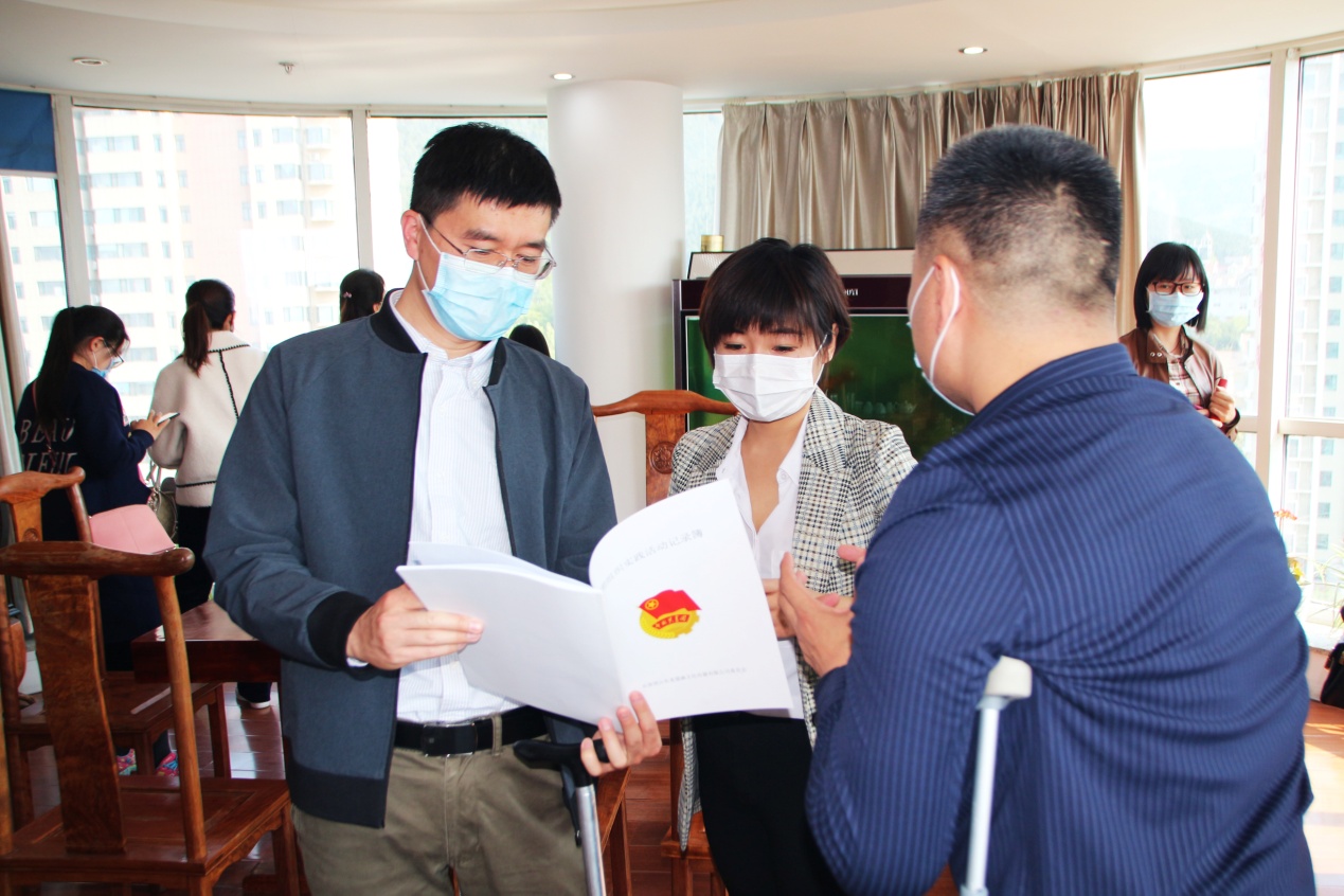 在王勇博士的陪同下,省残联机关单位各位领导先后参观了我集团企业文化墙、党建活动室、疫情防控考勤点、残疾人文化长廊以及各业务职能部门办公区域,对我集团疫情防控期间复工复产工作、企业党建和企业文化建设以及助残事业发展等情况进行了深入了解,并详细察看了企业“疫情防控工作”系列文件、支部党员“手抄党章”、“共青团组织实践活动”材料等支部党建资料和企业复工复产材料。